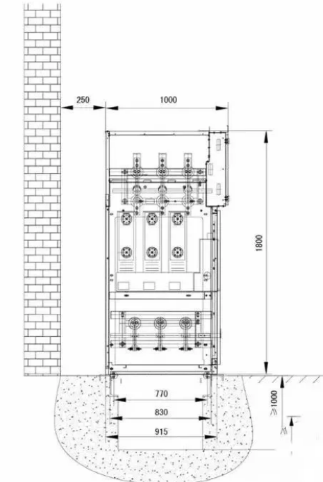 安装时按环网柜先后顺序排列在地基的槽钢上,将柜体靠紧,并用螺栓固定旋紧,柜面应排列整齐,柜顶与屋顶的距离应大于600mm。