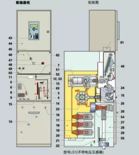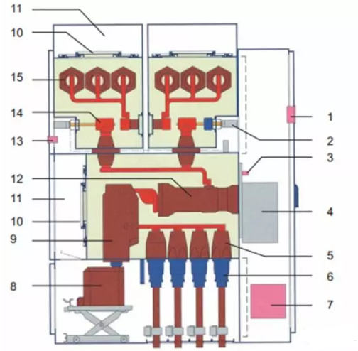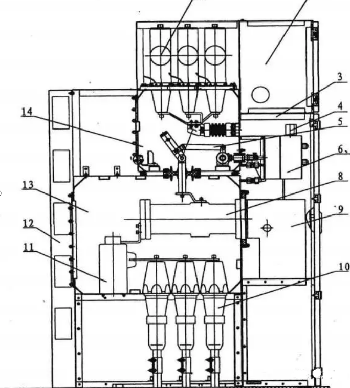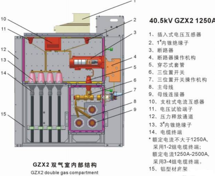 国内则主要是西安森源联合开发的GZX系列,额定电流在2500A及以下,其结构如下图:(目前市场上主要是侧扩和顶扩,单气室,双气室,三气室的等)国内代表性厂家主要有常州太平洋,宁波天安,正泰,顺德开关等。
