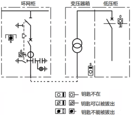 如图7所示,环网柜内部,隔离/接地开关与电缆室门之间的钥匙联锁,电缆室盖板打开后,钥匙被锁定,不能拔出插入到隔离开关锁,即不能操作接地开关;只有盖板合上,钥匙才能拔出,去操作接地开关分闸。而系统角度,只有接地开关合闸,钥匙才能被取出,去开变压器箱的门,实现变压器检修,同时低压断路器不能合闸。