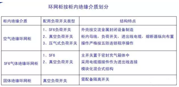 环网柜一般分为空气绝缘和SF6绝缘两种。柜体中,配空气绝缘的负荷开关主要有产气式、压气式、真空式,配SF6绝缘的负荷开关为SF6绝缘式,由于SF6气体封闭在壳体内,它形成的隔断断口不可见,通过增加观察窗便于观察。环网柜中的负荷开关,一般要求三工位,即切断负荷,隔离电路、可靠接地。产气式、压气式和SF6式负荷开关易实现三工位,而真空灭弧室只能开断,不能隔离,所以一般真空负荷环网开关柜在负荷开关前再加上一个隔离开关,以形成隔离断口。按柜内绝缘介质不同分为空气型和六氟化硫型;