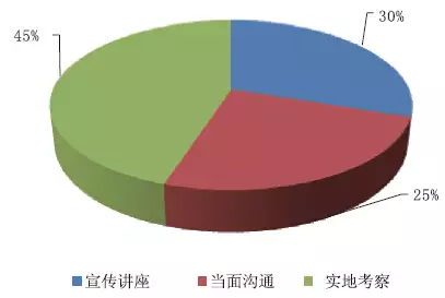 通过了解参与者了解新产品知识的途径,认为最有效的方式中:宣传讲座的占比30%;可以通过当面沟通的占比25%;可以参与实地考察的占比45%。如图16所示。