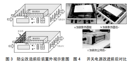 3.2在装置本体进风孔加防尘网,防止灰尘进入装置内部,设备维护人员定期对滤网进行清扫,从而减轻元器件表面覆尘,利于装置正常散热,如图3所示加装防尘网后开关电源示意图。对装置实施上述改进后,其改进前后对比如图4所示。