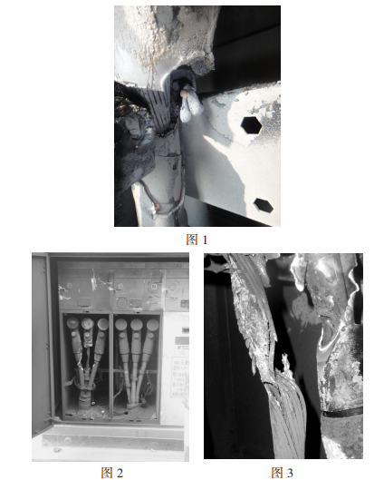 2009年2月15日,回南天,仙村站孔堂线在经历了长达18分钟的间歇性接地后速断跳闸,重合不成功,K5013-0003X电缆分支箱601开关B相进线电缆终端应力锥处首先短路烧毁(如图2)。据分支箱附近商铺店主反映,箱内曾继续宣布哗啪的响声并冒烟,终究传出爆炸声音。经开始剖析,事端原发点为B相应力锥尾部,因为密封不严,硅脂固化,在运转环境湿度较大的情况下呈现凝露,水气进入缆芯,导致绝缘强度破坏产生爬电。终究由间歇性接地发展到三相短路(如图3)。此次故障相同导致分支箱气室破损泄漏,分支箱报废。