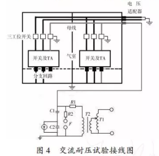 本次试验对母线进行交流耐压试验,按图4进行试验接线,加压端口在4×15避雷器电缆插口处。