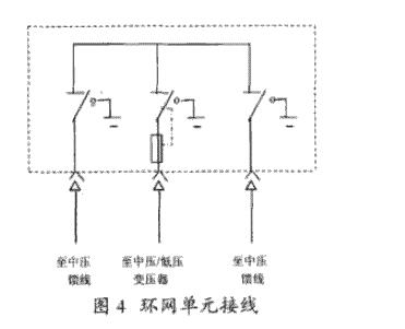 图4给出了一个最简略的全封闭环网箱的接线图。中压馈线的进线装有负荷阻隔开关,通过一个串接限流熔断器的负荷开关把变压器接到环网体系上,既?;さ奖溲蛊鞯墓收希帜茏韪艄收媳溲蛊?,使环网不致断开。现在运用的柜环网都是在根本接线单元的基础上改善、扩展而成的。