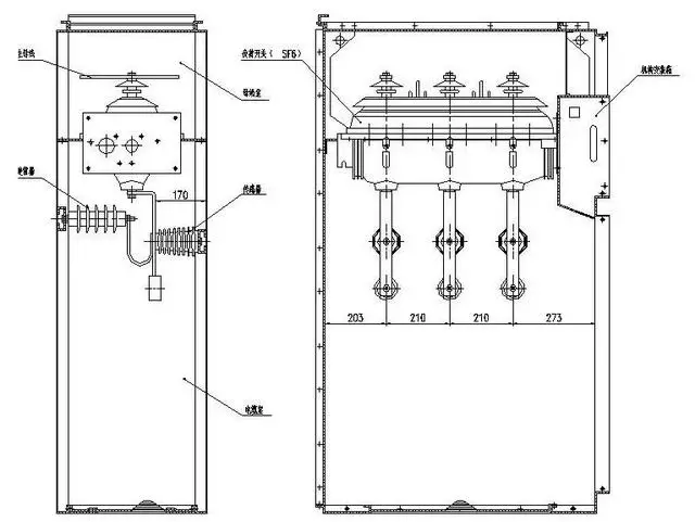 e、操动机构室位于环网柜正面,在每个功能回路中,负荷开关配有人力(或电动)储能弹簧操动机构,接地开关配有人力储能弹簧操动机构,面板上有分别用于负荷开关合闸操作和手动分闸旋转钮及接地开关的分、合闸操作孔,负荷开关分、合闸位置指示灯和电动分、合闸按钮,并设有模拟线、开关状态显示牌及加锁位置,负荷开关和接地开关的操作具有联锁装置,以防止误操作。
