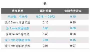 下表给出了金属表面辐射系数8与太阳光的吸收率示例。