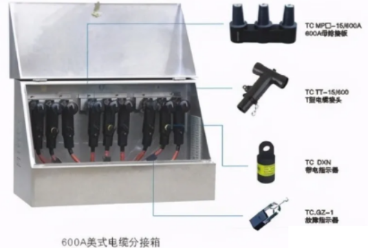 1)美式电缆分支箱,它以单向开门、横向母排为主要特点,具有宽度小、组合灵活、全绝缘、全密封等显著优点。600A主回路采用旋入式螺栓固定连接;分支回路采用拔插式连接。