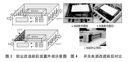 3.2在安装本体进风孔加防尘网,避免灰尘进入安装内部,设备维护人员定期对滤网停止打扫,从而减轻元器件外表覆尘,利于安装正常散热,如图3所示加装防尘网后开关电源表示图。对安装施行上述改良后,其改良前后比照如图4所示。