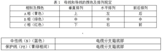 (1)选用选用矩形母线,质料为T2电工铜。并选用不同相色热缩套管做绝缘处理。热缩套管不得开裂和起皱,母线接头处用热缩绝缘盒关闭。绝缘热缩护套材料应具有阻燃、防腐、抗老化的要求,老化寿数不小于30年,具体试验方法和要求参照GB/T2951.14中规则实施。(2)铜排截面的挑选应确保能够耐受IEC60298中推荐的额定短时耐受和峰值耐受电流的要求,N相(L0)母线与三相母线规范相同,PE排截面不低于相排截面的1/2。其间设于户外的低压电缆分支箱配备4根母排(3L+PEN),设于户内的低压电缆分支箱配备5根母排(3L+N+PE)。(3)设备中母线和导线的颜色及摆放应符合GB/T4026和GB7947及表1的规则;