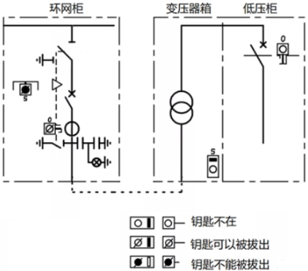 如图7所示,环网箱内部,阻隔/接地开关与电缆室门之间的钥匙联锁,电缆室盖板翻开后,钥匙被确定,不能拔出刺进到阻隔开关锁,即不能操作接地开关;只需盖板合上,钥匙才华拔出,去操作接地开关分闸。而体系视点,只需接地开关合闸,钥匙才华被取出,去开变压器箱的门,结束变压器检修,一同低压断路器不能合闸。