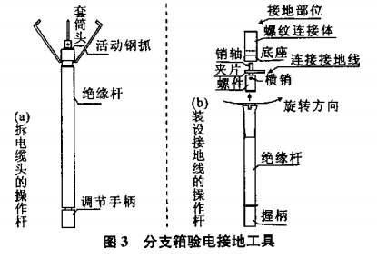 (3) 装设接地线的操作杆(见图3b)它与其它广家规划不同,采用带磁性的接地安装(其接地线三相一组),可使人在平安活动范围内不用直触摸摸分支箱,不用去除金属双头螺杆即可直接装设接地线,愈加便利平安。运用办法为:a)先接接地端,后接导体端。接地安装局部与绝缘操作局部经过磁性吸住,旋转操作棒,横销对应卡口可卡住并带动旋转接地安装。b)将螺纹衔接体(其螺纹规范按现有多数电缆分支箱双头螺杆的2种尺寸而定)套在电缆分支箱双头螺杆上,旋转绝缘杅将其拧紧,即接地安装前端接好。c)推绝缘杆使弹簧缩短旋转一视点,使销轴脱出底座槽口,接地线后端螺纹开端受力。旋转绝缘杆,使夹片与螺纹衔接体和螺件紧密触摸,即接地安装后端安装坚固。d拔出绝缘杆反复操作将三相全部接好,即接地线装设完毕。