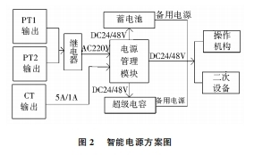 2.6智能电源环网柜的操作组织、操控器、通讯终端等二次设备都需求完毕不连续供电。为了行进供电的可靠性,请求在供电电源失电时,二次回路仍然会有电源,能够持续可靠的动作,环网柜中有必要具有备用电源。为了行进供电电源的可靠性本电源的规划首要选用了如下办法:(1)环网柜普通选用双进线,两条进线互为备用给电源的充电模块供电,当其中一条进线失电时,由继电器将另一条进线的220V电源转给充电???,保证整个柜子的二次回路持续供电。(2)当环网柜的两条进线都失电的时分,为了使二次回路持续带电,需求由备用电源持续供电。如今首要的备用电源是不连续电源(UPS)和蓄电池,还有的选用超级电容供电。为了行进供电的可靠性,本电源方案选用蓄电池与超极电容相分离,两种电源可互为备用,能够进一步行进供电的可靠性。智能电源的方案如图2所示。