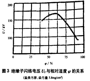 分支箱地处交通要道,背靠山坡,面向公路,尘土很大,绝缘子表面的积尘较多,在污层受潮时。其中所含可溶性盐类及酸碱等成分溶解于水中,使表面电导骤增,泄漏电流增加,大大降低闪络电压。一般说来,绝缘子的污闪电压随其污染程度的增加而降低。污染严重时,随着污染程度继续增加,污闪电压的下降已很缓慢,但这时污闪电压常常已经低于工作电压了。干燥污秽的电阻较大,它并不降低绝缘子的闪络电压,一般当空气相对湿度小于50%~70%时,沿面闪络电压不会降低;高于这数值时,随着湿度增加,闪络电压迅速下降,如图3所示。实际运行中,绝缘子污闪事故都发生在雾、露、阴雨绵绵等高湿度的天气.因为在这种条件下、积尘中水深性的盐类溶解,使污层成为半导体层,大大增加汇漏,降低闪络电压。本次事故正值重庆百年不遇的大雨期间,而开关柜体的密封较差,柜内相对湿度已达90%以上,开关柜的操作机构机构严重腐蚀,以至于完全不能正常操作,由脏污沿面放电的过程的讨论可知,污层的电阻越大,泄漏电流越小,放电发展越困难,闪络电压也相应提高。在同样污染和潮湿条件下,介质表面形状、两极间的沿面最短距离即泄漏距离是影响表面电阻和闪络电压的重要因素。泄漏距离增加,污闪电压也增加。不同的污秽情况对线路及变电站绝缘的影响程度是不同的,因此应根据不同的污移情况,采取相应的绝缘标准保证电网安全运行"。目前, 我们用泄漏比距来估计脏污条件下绝緣子的耐污性能。由于我局所辖电网为渝中区,被定为三级污区,按变电站设备考虑泄澜比距应大于4cm/MkV。