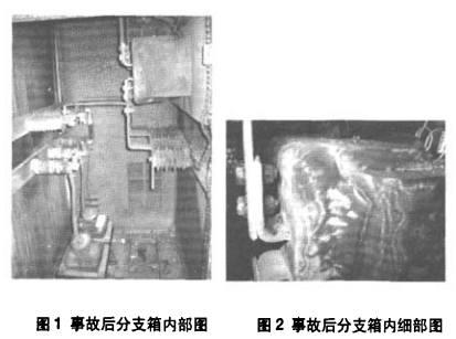 2007年7月18日某地输配电线路产生跳闸,在巡线至石板坡电缆分支箱时,发现电缆分支箱两端的开关柜俑壁产生严峻变形、601进线开关柜面板有飞弧、放电及炭黑等现象。外观上,箱体内水迹明显。外表柜门已锈死,不得不撬开,操作组织已无法翻滚、只能将其溃散后翻开关柜门。翻开#601开关柜电缆室发现:计量TⅣV的熔断器及支撑绝缘子两相全部炸碎、另一相熔断器产生割裂,支撑绝缘子产生破损,AT外表有爬电痕迹,柜体多处存在放电痕迹,如图1所示。翻开相邻间隔检查,状况相同严峻,导电部分受潮严峻,铜排及固定镖栓已长卤锈,柜体外表有多处爬电痕迹,见图2。该分支箱为某电器厂制作,2003年投运、仅3年多。