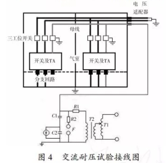 告知实验时,交流耐压值为出厂值的100% ,时间1 min。投运后确诊性实验时,交流耐压值为出厂值的80%,时间1 min。实验接线如图4所示。