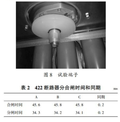 本次实验选取422断路器进行机械特性查验,按图6进行实验接线。将4221阻隔开关置于接地方位,将实验端子接到柜内电缆接口,然后将实验线接到实验端子下端进行实验。实验端子如图8所示。422断路器分合闸时间和同期见表2。
