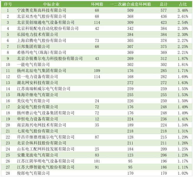 表2国网环网箱产品中标企业(市场份额超过1%部分)