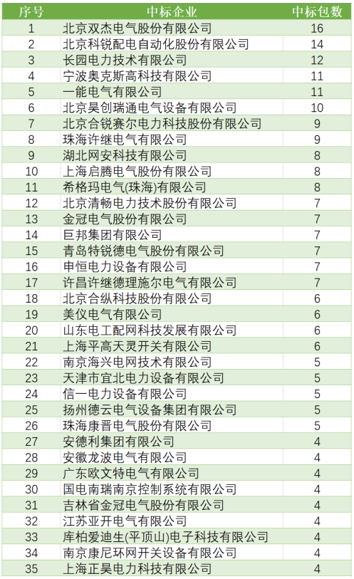 企业中标包数方面,共有15家企业中标2个或以上包数,占中标企业总数的52%。北京科锐配电自动化股份有限公司中标包数最多,共6个包。