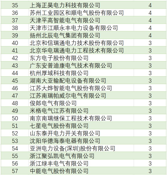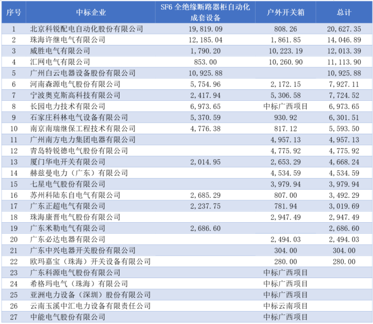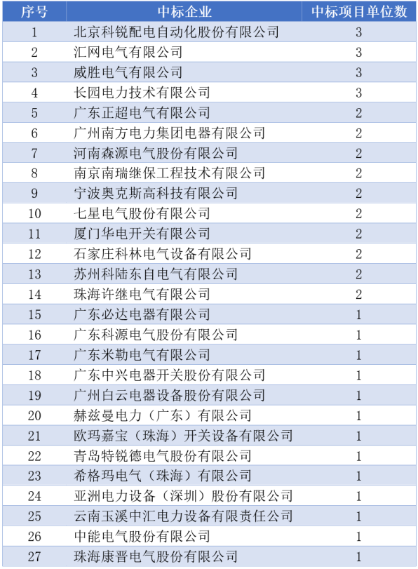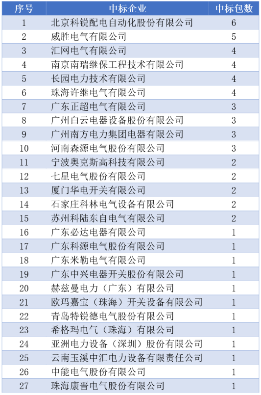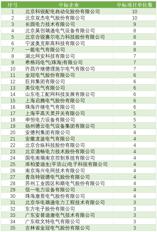 总体中标数量方面,北京科锐配电自动化股份有限公司中标金额达到约2亿元;另有4家企业超过约1亿元。
