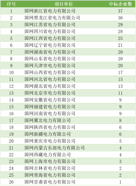 各电力公司中标企业数量方面,在广东电网公司共有15家企业中标,全部项目单位都有超32家企业中标。